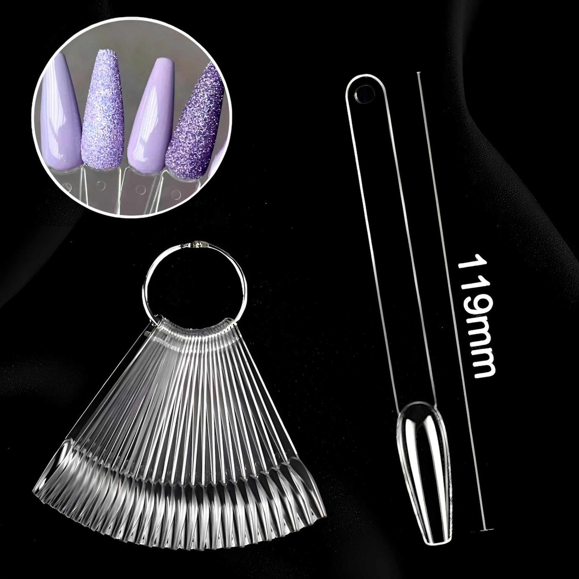 Set di 50 tip a forma di ventaglio, ideali per mostrare i colori di smalti gel, smalti tradizionali o acrilici. Perfetti per creare una palette colori, esercitarsi nelle nail art e presentare le tonalità alle clienti. La plastica trasparente valorizza al meglio ogni colore applicato.