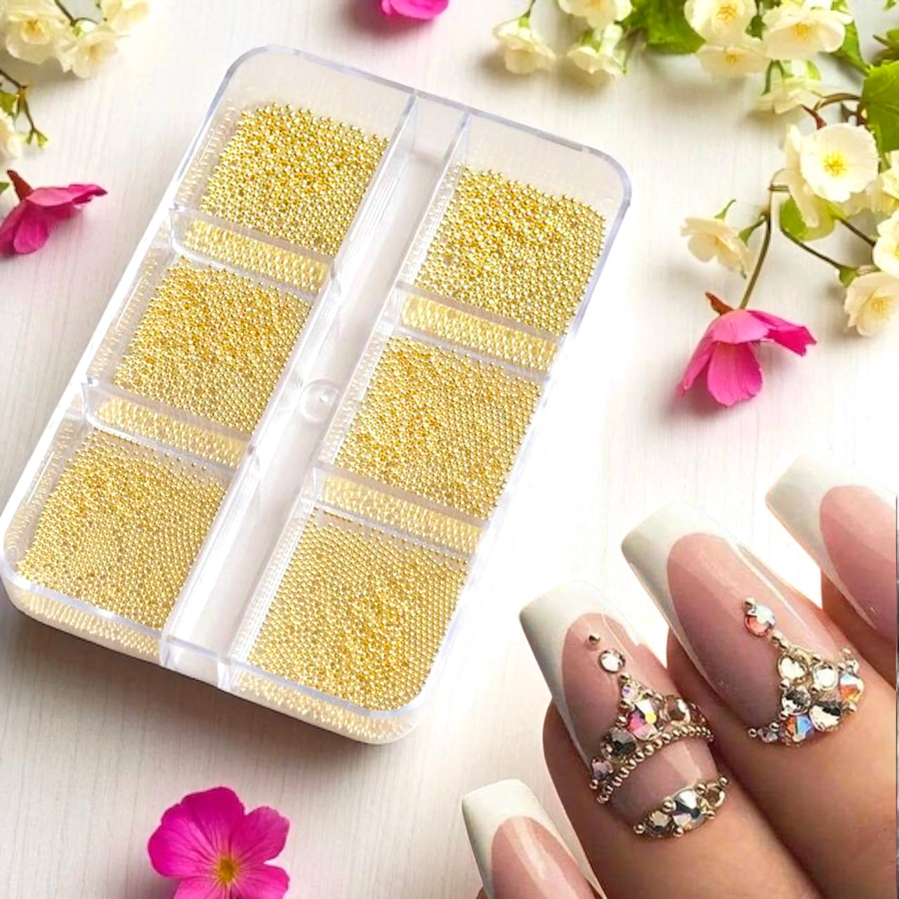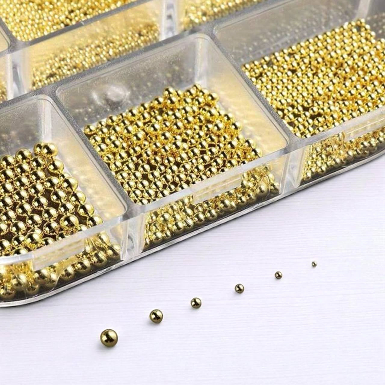 Set di mini accessori dorati per nail art, 6 scomparti (micro sfere in acciaio e elementi decorativi)
